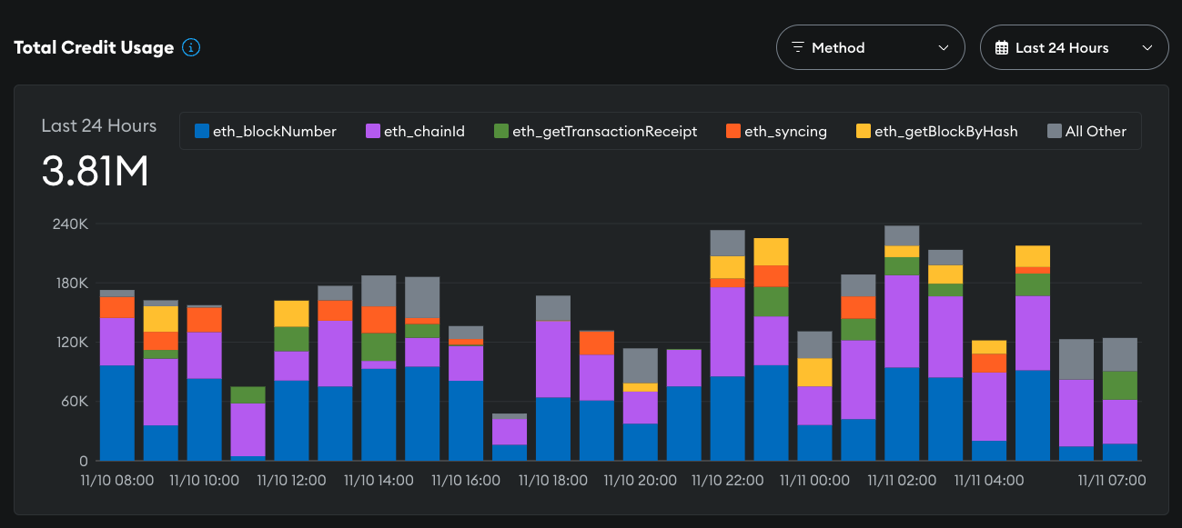 View your usage for the previous 24 hours, 7 days, or 30 days by methods used, networks, or API key.